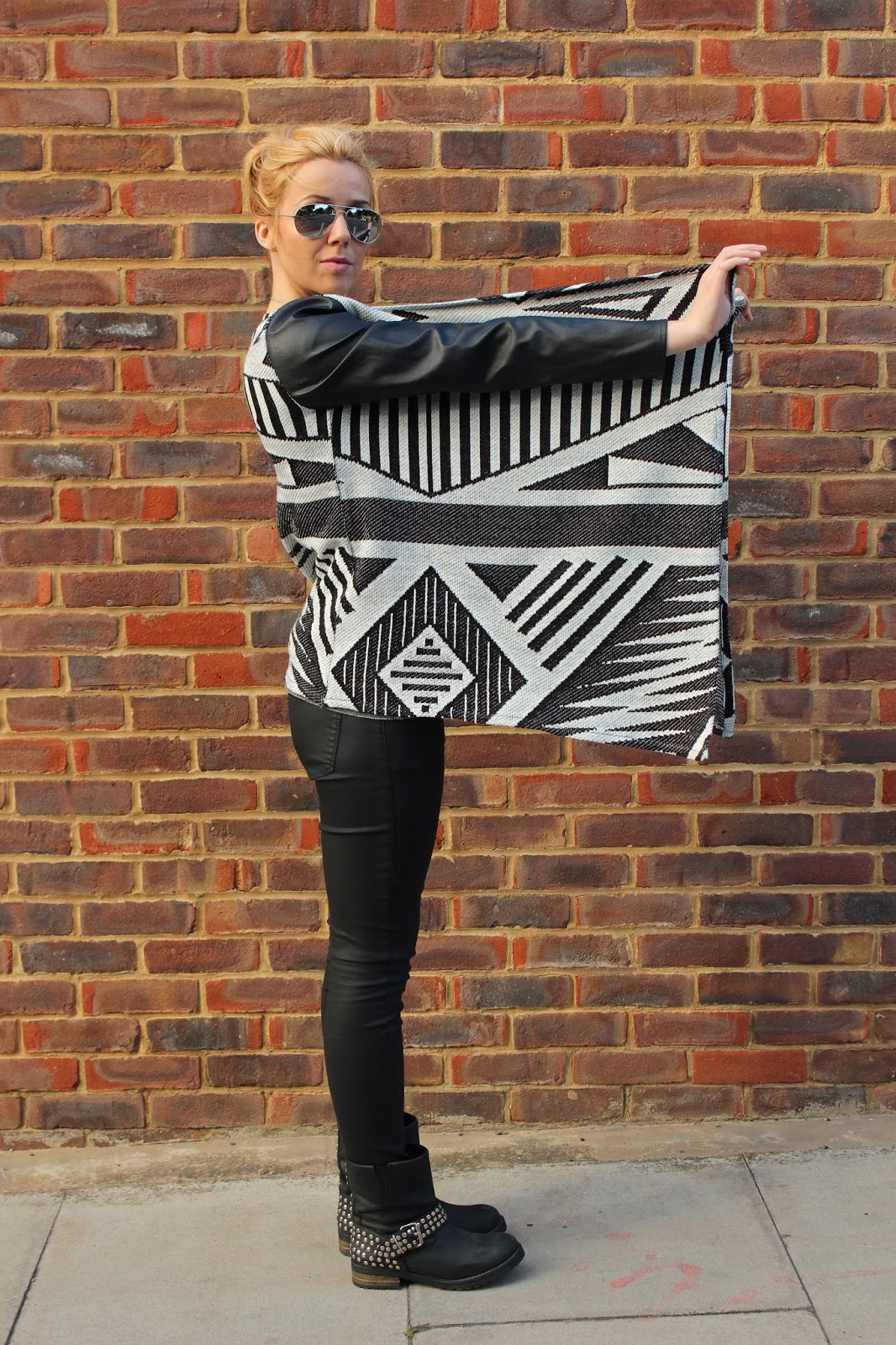 This cardigan is a long, aztec 'waterfall' with leather sleeves- which makes it looks more 'rocky'.